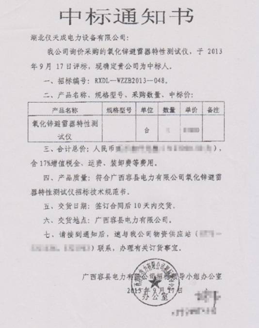 主題詞:廣西容縣電力 廣西水利電業(yè)集團(tuán) 儀天成電力氧化鋅避雷器 中標(biāo)通知書(shū)
