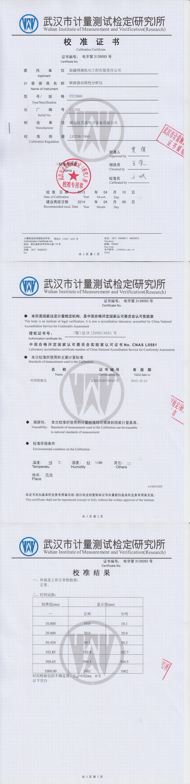YTC3980斷路器動(dòng)特性分析儀資質(zhì)證書