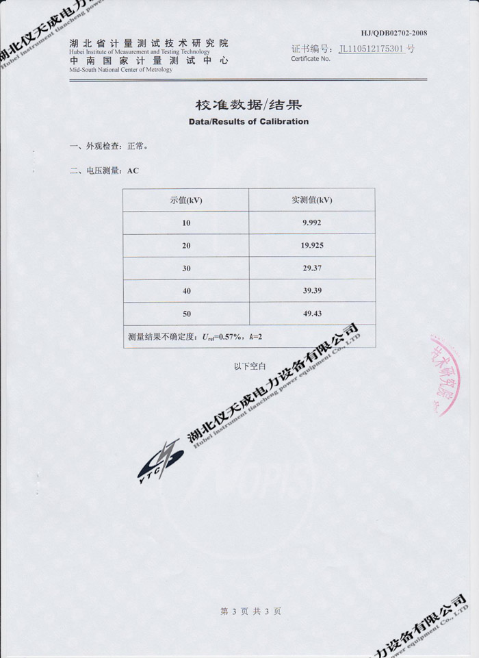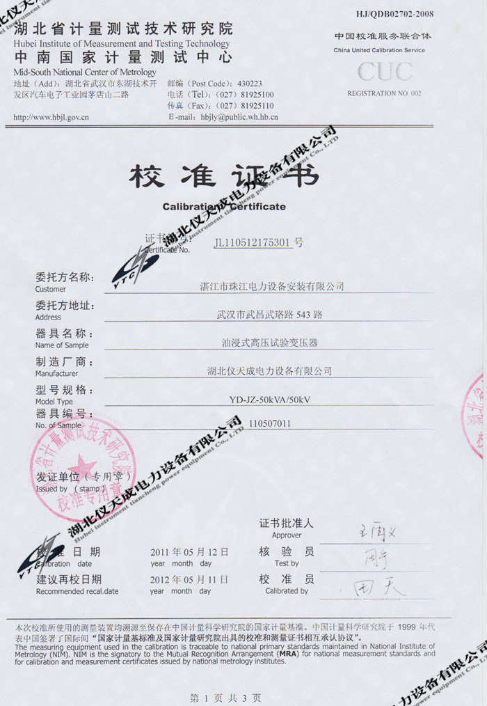 轉載:"YD-JZ-50kVA/50kV油浸式試驗變壓器的資質(zhì)證書" 請注明來源于儀天成電力。 更多技術問題請致電儀天成電力客戶服務:027-87876585,技術部專線:027-87876585,在線客服:719388481