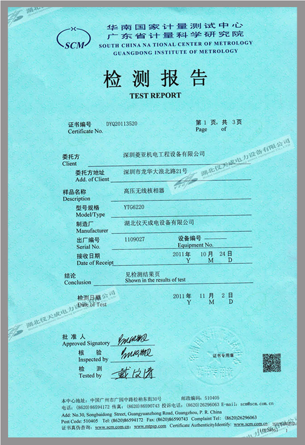 轉(zhuǎn)載:"YTC6220高壓無(wú)線核相器鑒定證書" 請(qǐng)注明來(lái)源于儀天成電力。 更多技術(shù)問(wèn)題請(qǐng)致電儀天成電力客戶服務(wù):027-87876585,技術(shù)部專線:027-87876585,在線客服: